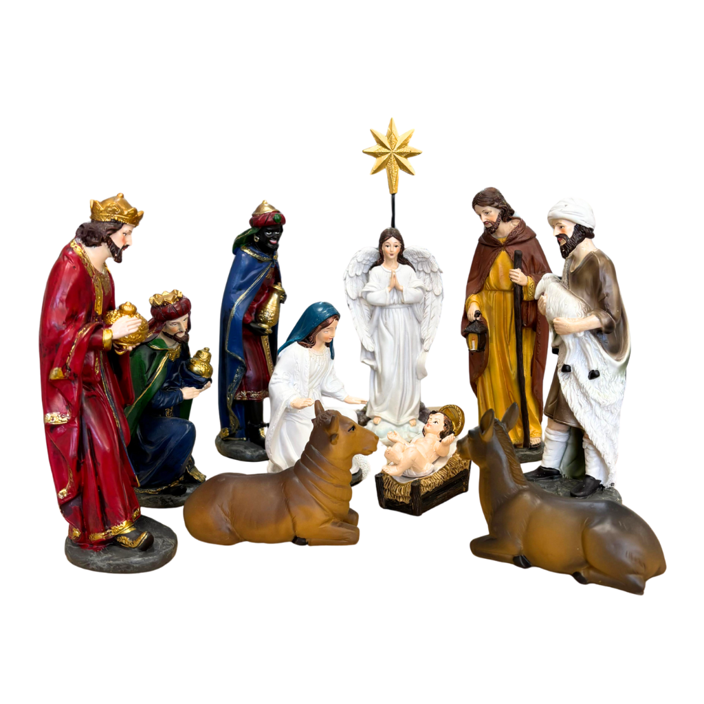 As peças são cuidadosamente trabalhadas, com cores suaves e expressão serena, criando uma cena cheia de paz e devoção.