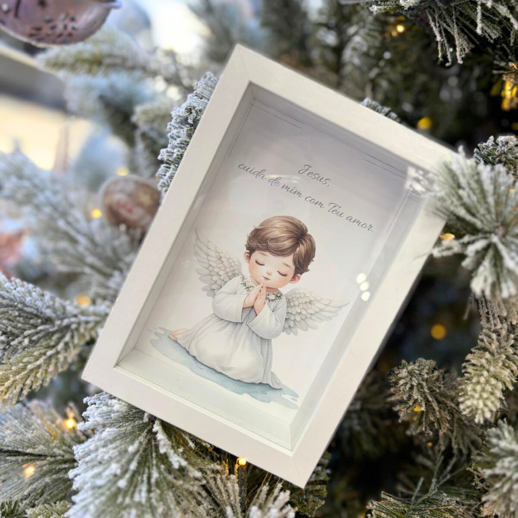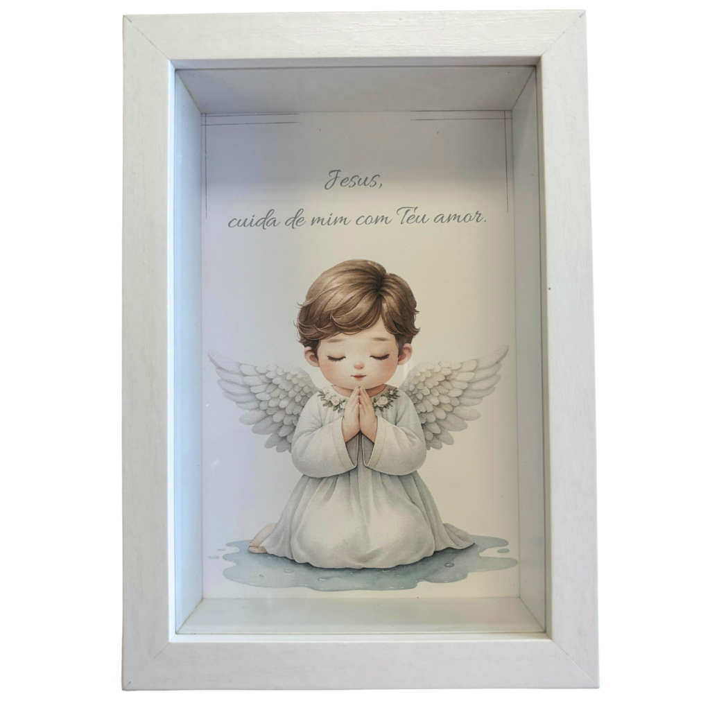 Um quadro delicado que traz um anjinho em oração, pedindo o cuidado de Jesus.