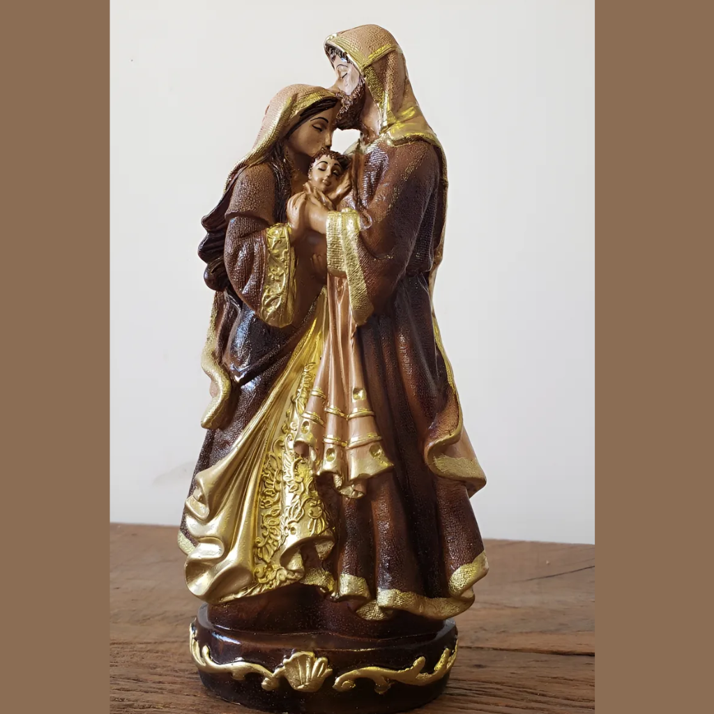 Símbolo de amor, união e proteção, esta belíssima imagem da Sagrada Família foi cuidadosamente esculpida em gesso premium e pintada à mão por talentosos artesãos mineiros.