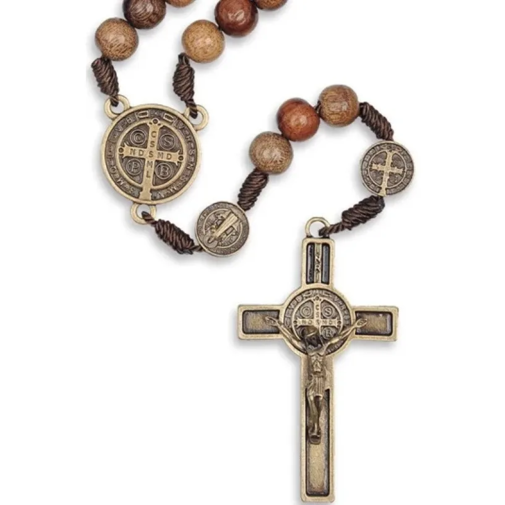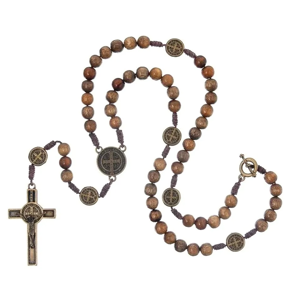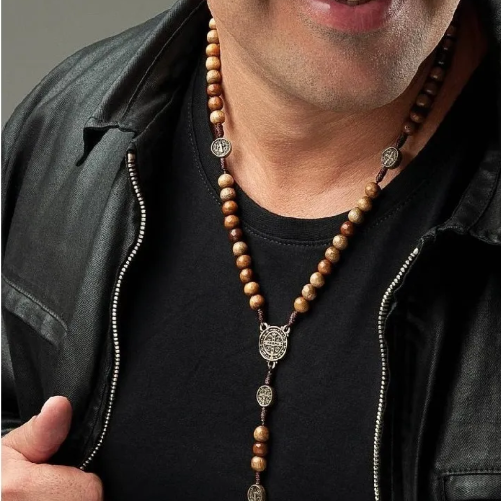 Contas em Madeira Imbuia c/ Cruz São Bento e Medalhas em Ouro Velho c/ Fecho prático e fácil de colocar e retirar.
