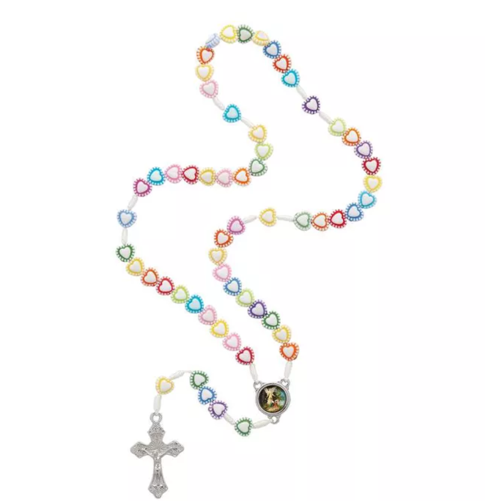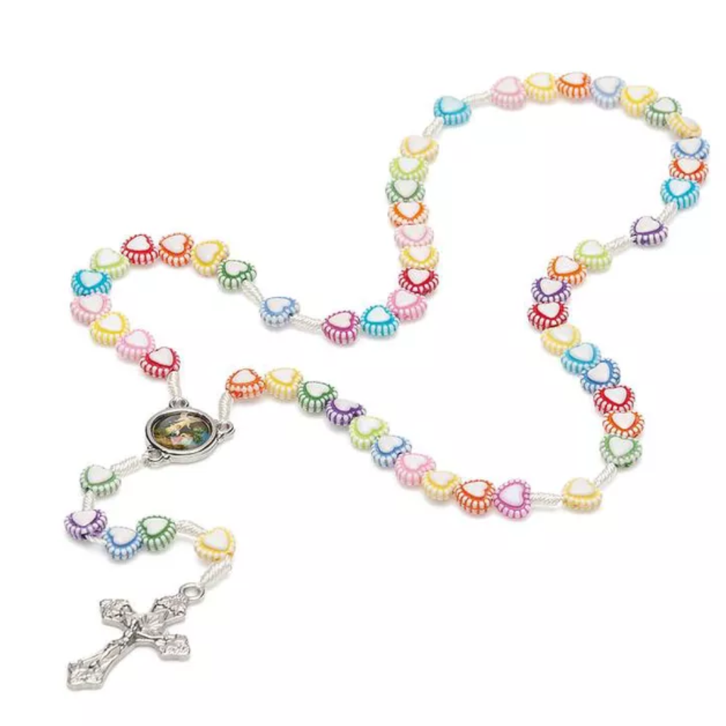 Feito com miçangas em formato de coração, este terço proporciona um toque especial de ternura e carinho. Ideal para momentos de oração em família ou eventos religiosos infantis.