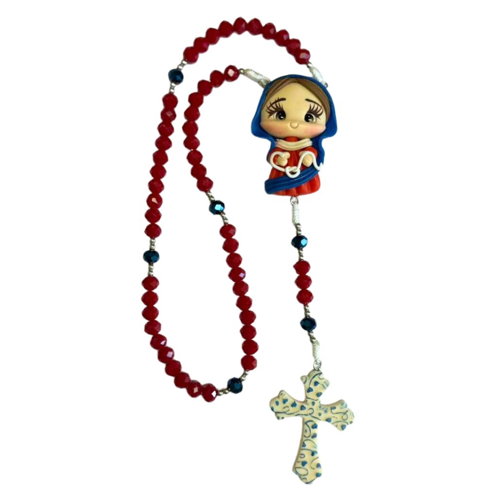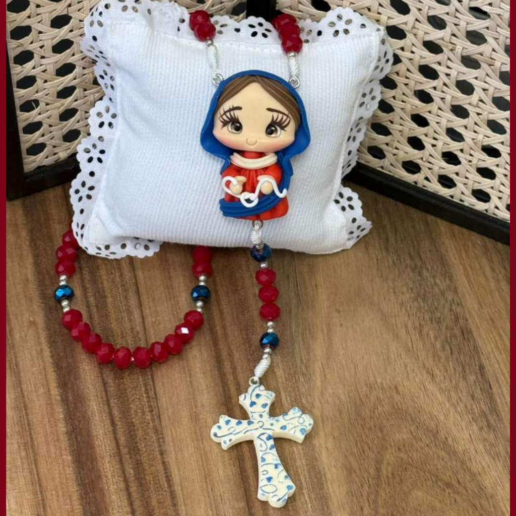 O modelo vermelho traz contas acrílicas foscas e elegantes, complementadas por detalhes sutis e pelo pingente da Desatadora dos Nós em estilo infantil, trazendo suavidade e encanto à peça.