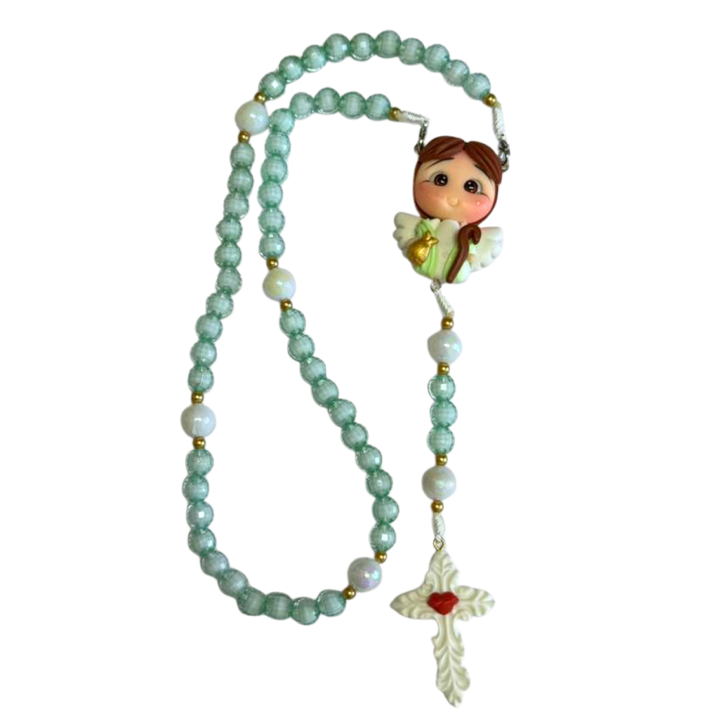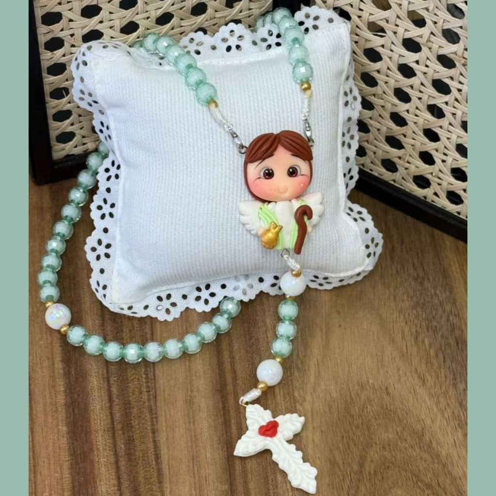 Um terço suave, delicado e cheio de significado, inspirado em São Rafael Arcanjo, o mensageiro da cura, da proteção e do cuidado de Deus.