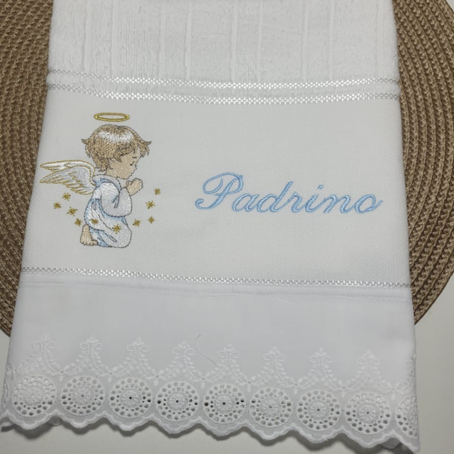 Com bordado delicado de anjinho, a palavra “Padrino” e acabamento em renda, esta peça transmite ternura, fé e carinho.