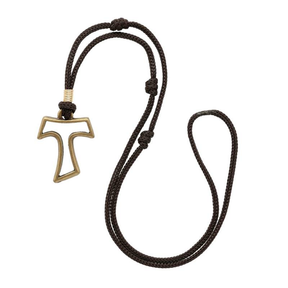 Lindo colar com pingente Tau em metal vazado, símbolo de fé, proteção e espiritualidade. A peça acompanha cordão resistente com nó ajustável, trazendo um estilo simples, rústico e cheio de significado.