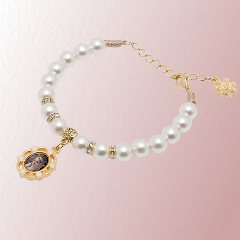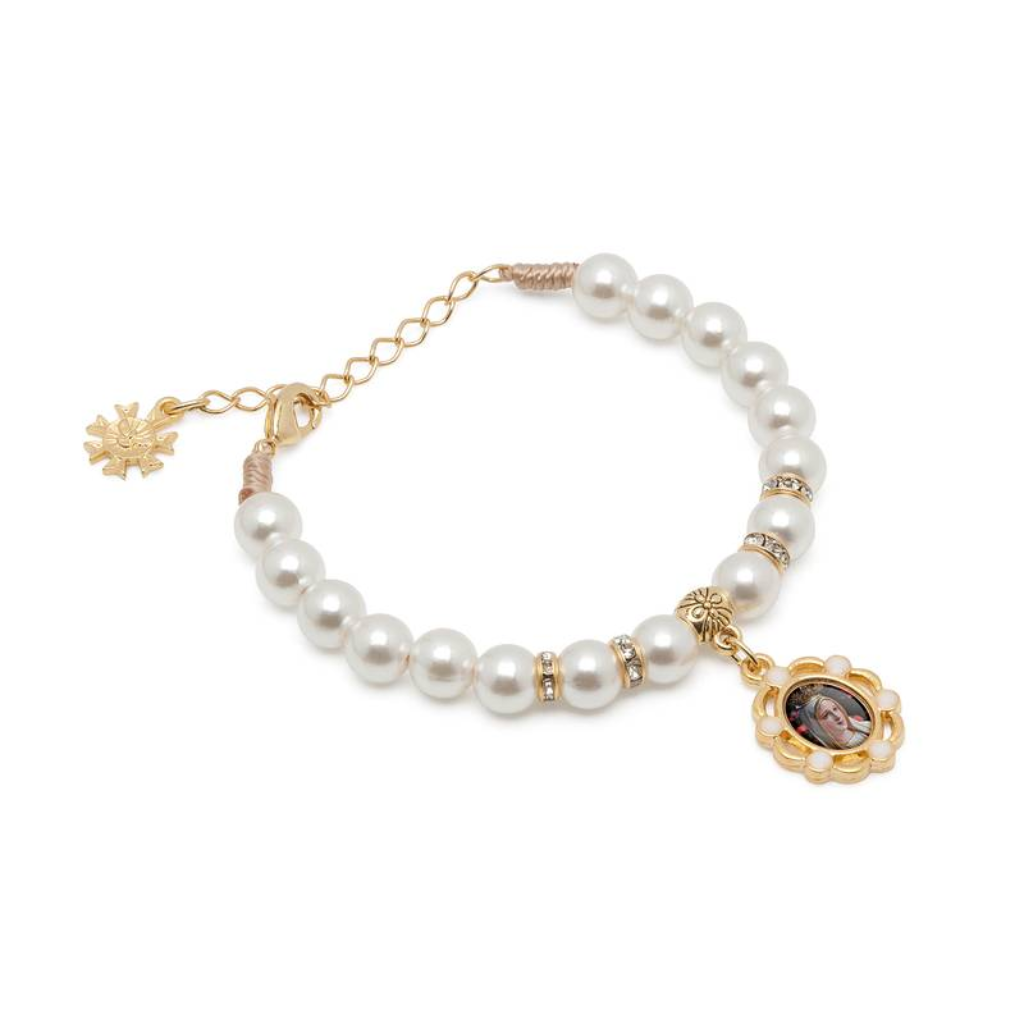 Pulseira em cordão com contas de pérola de 8mm e medalha dourada resinada de Maria Passa à Frente e Espírito Santo.
