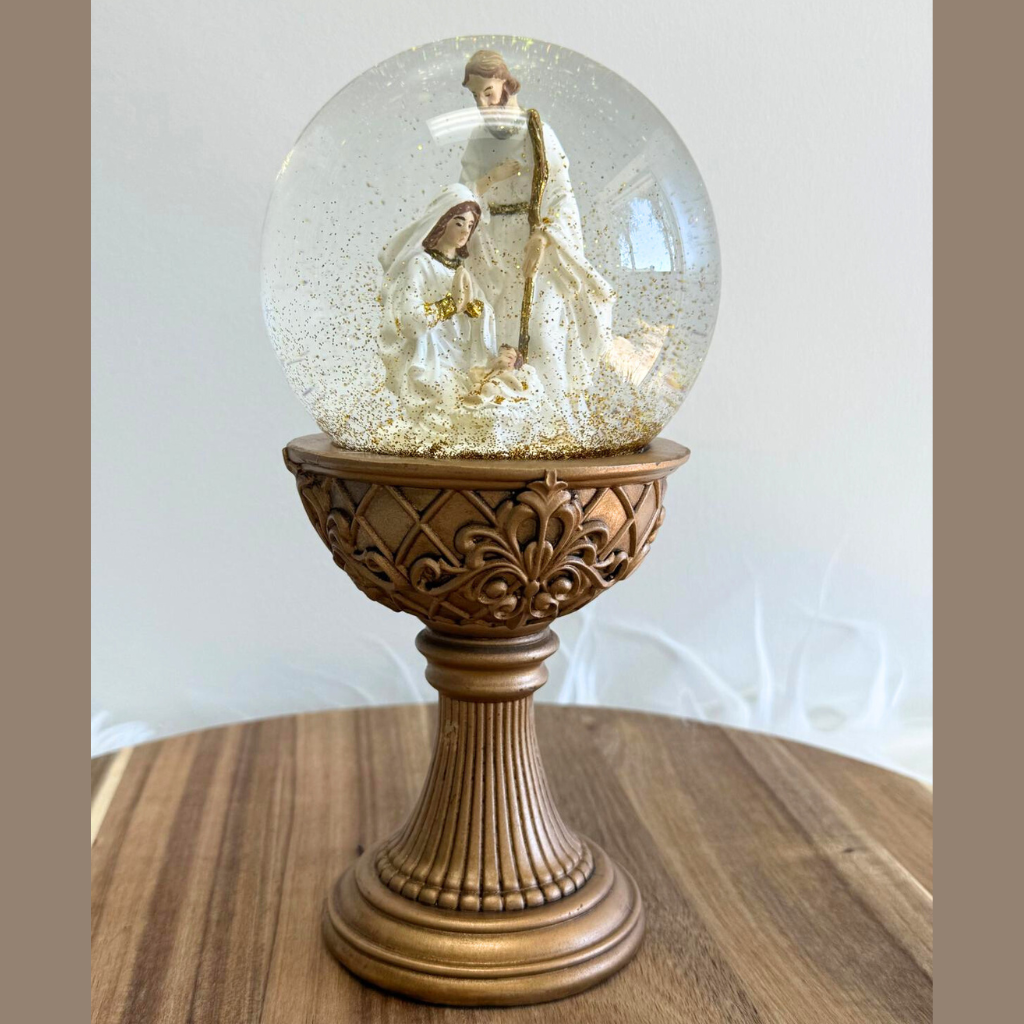 O globo do presépio traz a cena do nascimento de Jesus com efeito de neve e iluminação, criando um ambiente de ternura e fé.