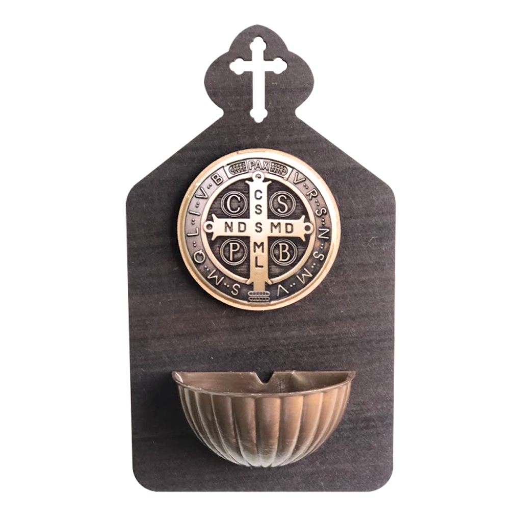 Apresentamos a Pia para Água Benta Medalha de São Bento , ela é o recipiente ideal para você depositar a água abençoada pelo Sacerdote de sua paróquia, para que, sempre que desejar, você consagre sua vida e de sua família à intercessão de São Bento