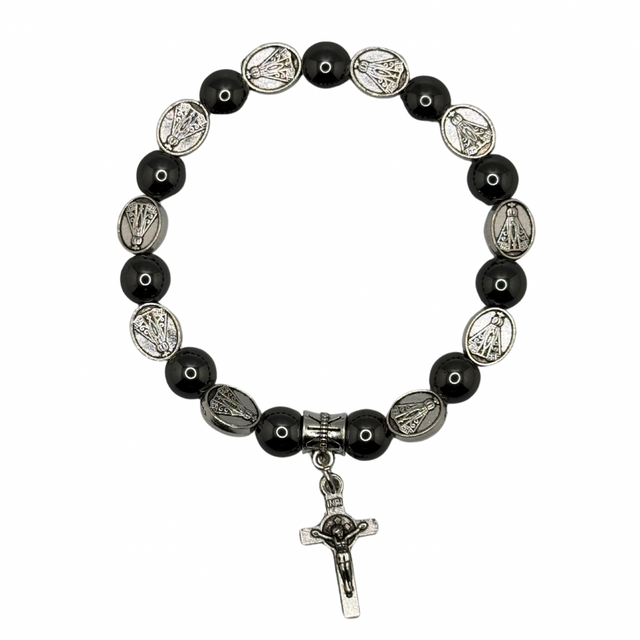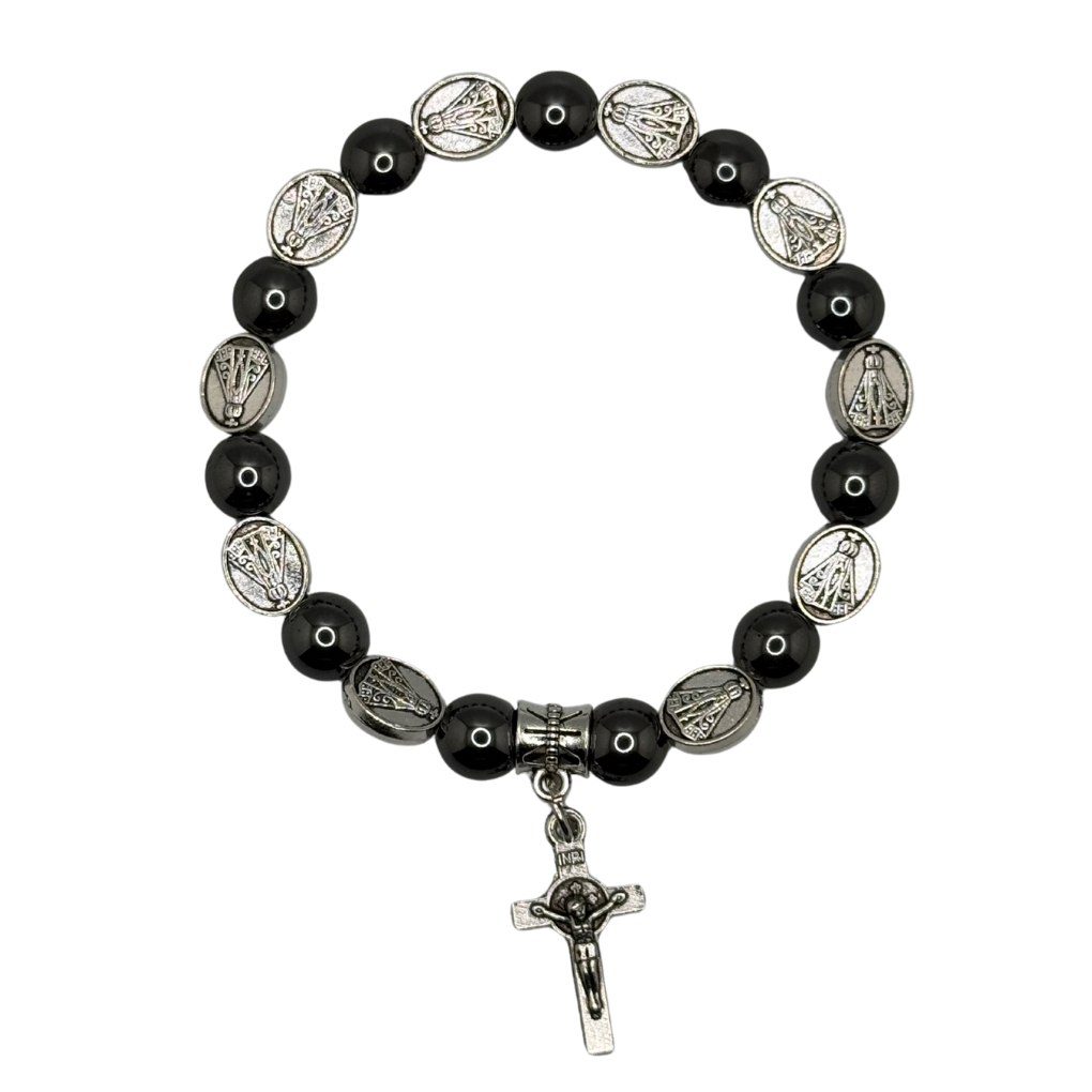 Pulseira de Nossa Senhora Aparecida em pedras hematita e medalhas em aço inox.