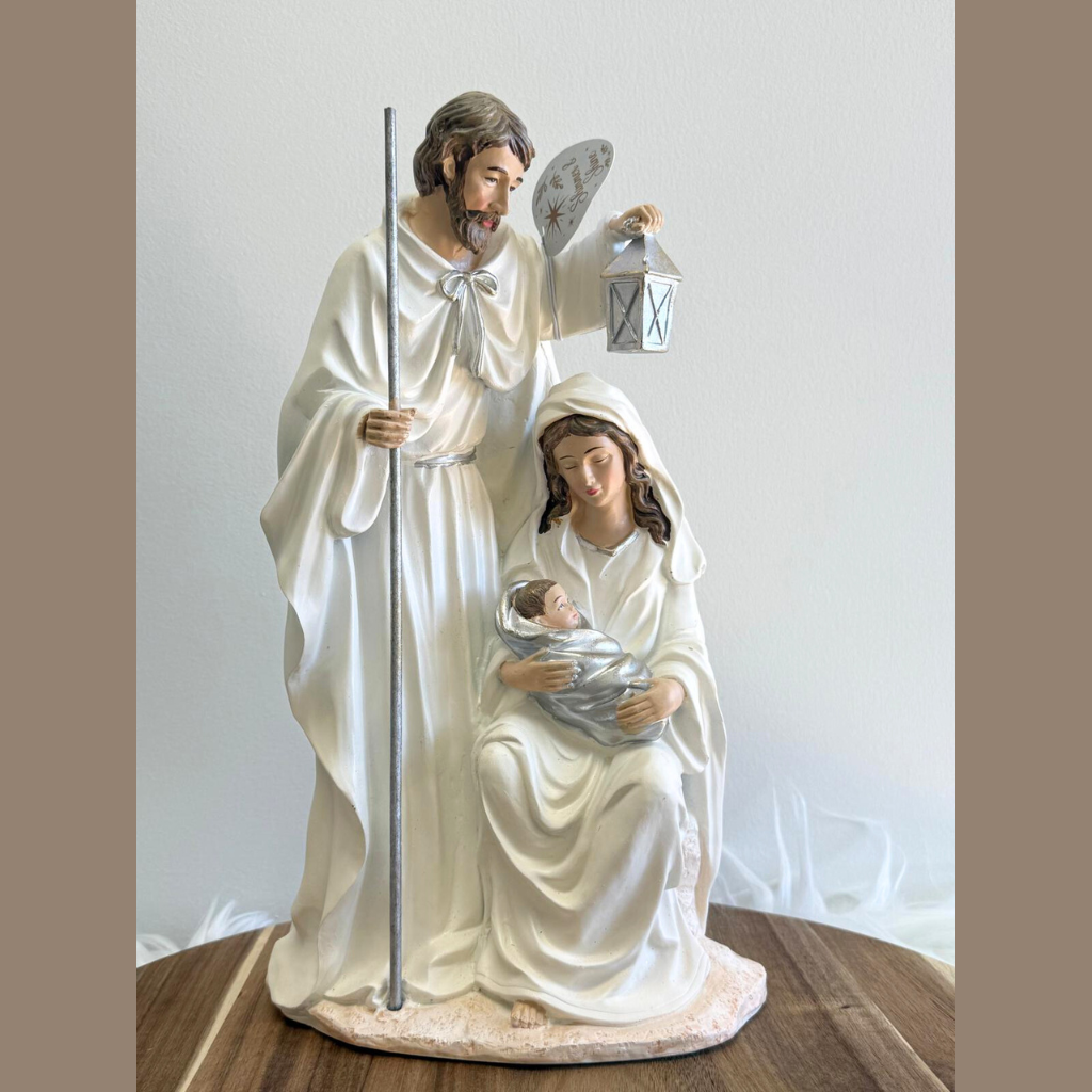 Esta belíssima escultura da Sagrada Família em tons brancos e prateados reflete serenidade e esperança.