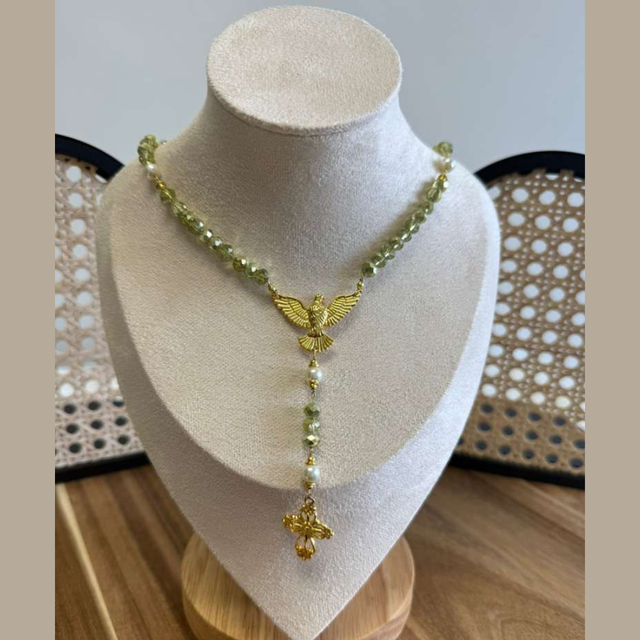 Um colar de fé e sofisticação. Com cristais facetados em tom verde-claro e detalhes dourados, ele traz o pingente do Espírito Santo, símbolo de luz e presença divina.