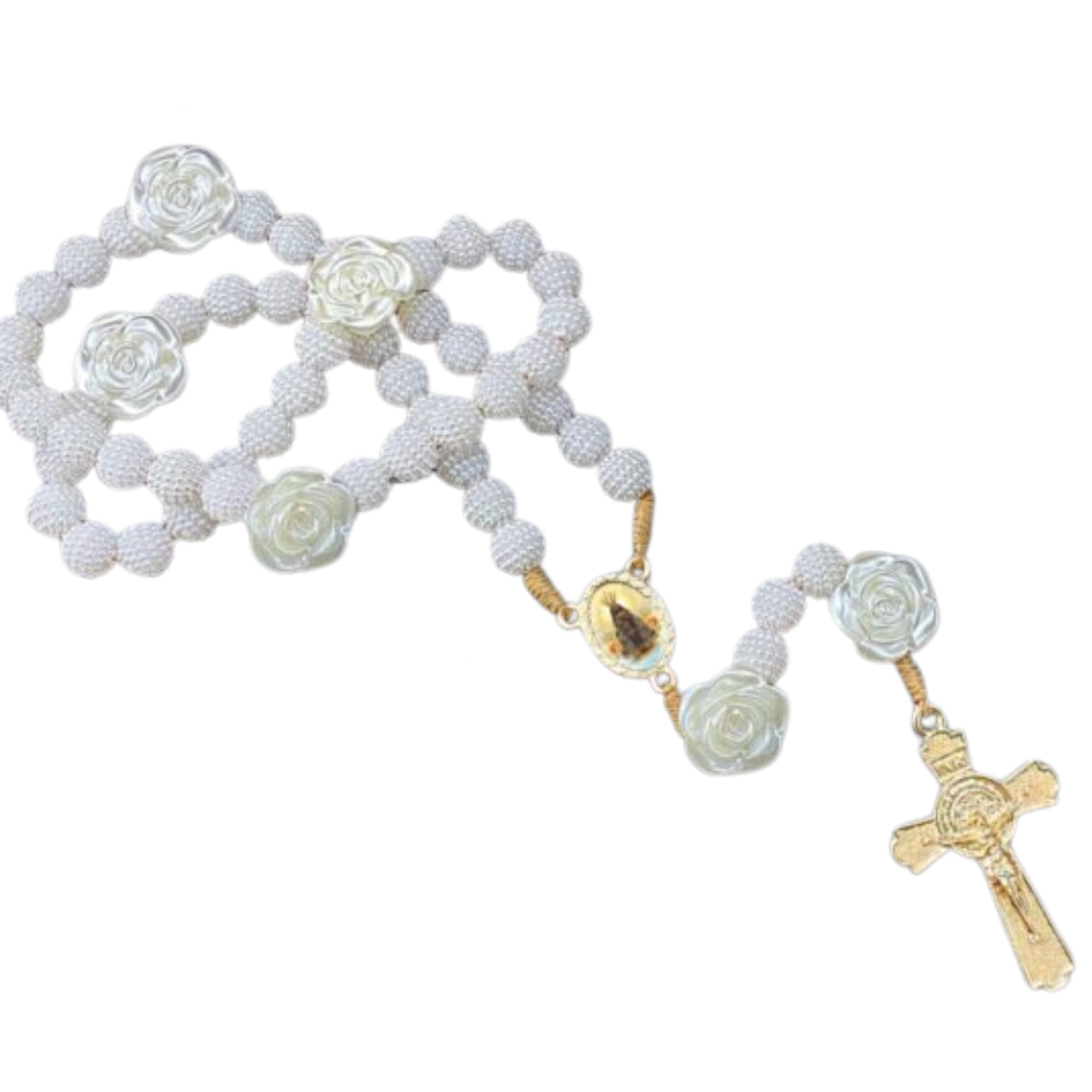 Terço Craquelado de Nossa Senhora Aparecida, com detalhes delicados em flor, perfeito para fortalecer sua fé e trazer proteção e bênçãos para sua vida. Um presente especial para quem busca proximidade com a Padroeira do Brasil.