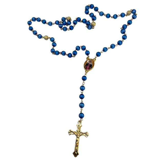 Uma peça delicada e de grande significado espiritual. Com contas de acrílico na cor azul, o terço é leve, resistente e ideal para momentos de oração e reflexão. As contas apresentam um brilho suave, representando a serenidade e a devoção. No centro, há uma medalha com a imagem de Nossa Senhora das Lágrimas, simbolizando proteção e intercessão.