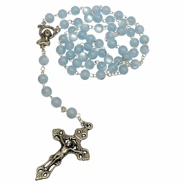 Terço Italiano Perolado Azul, feito em polietileno com pintura perolada, que transmite um efeito de madrepérola. Rezar o terço nos deixa mais perto de Deus e Nossa Senhora, pois cada conta que rezamos é como se estivéssemos oferecendo uma rosa a Maria, mãe de nosso Senhor, por isso nosso cuidado ao escolher este grande símbolo de amor a Nossa Senhora.