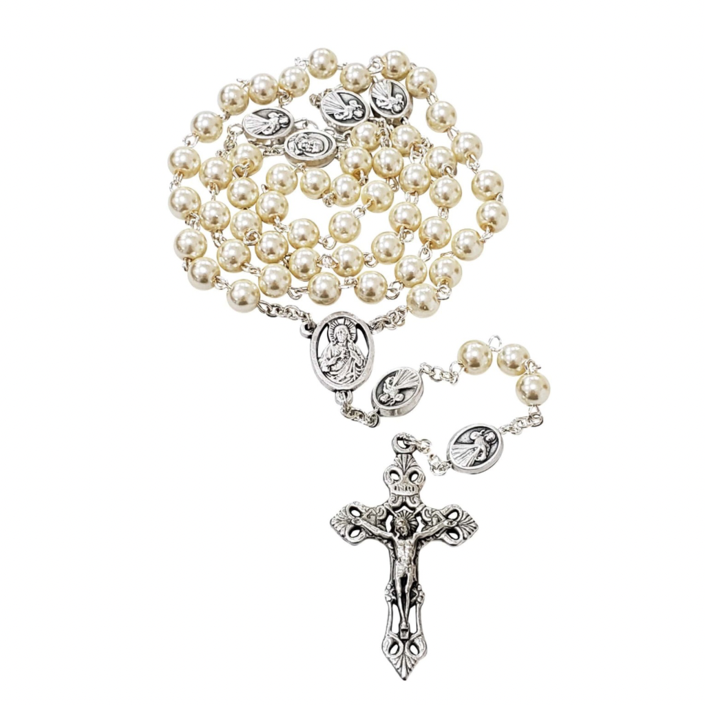 Conhecido como pérola de vidro, este terço traz a delicadeza e elegância de uma pérola, pois em seu processo de fabricação as contas de cristais de murano são cuidadosamente pintadas. Entre as dezenas no que chamamos de Pai – Nosso as medalhas de alpaca rotulam o terço com seu Santo de devoção. Nossos terços trazem consigo o encanto e a tradição da Itália. Nota-se que cada detalhe foi feito com muito carinho, suas contas peroladas e corrente de ZAMAC, realçam sua delicadeza e riqueza de detalhes.